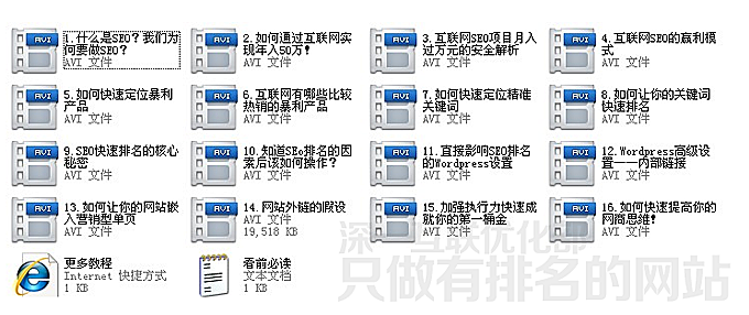 本套深一SEO視頻培訓課程包括20部高清視頻+清晰語音+整齊的文本條目,手把手教會快速從主流搜索引擎上獲得排名,從而獲得無限網絡商機。
